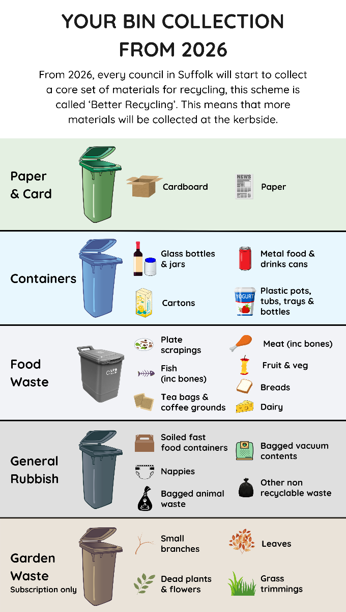 The changes will also help the environment by increasing Suffolk’s recycling rate, reducing the amount of waste that goes into our rubbish bins and decreasing the carbon impacts of Suffolk's waste and recycling collection service.